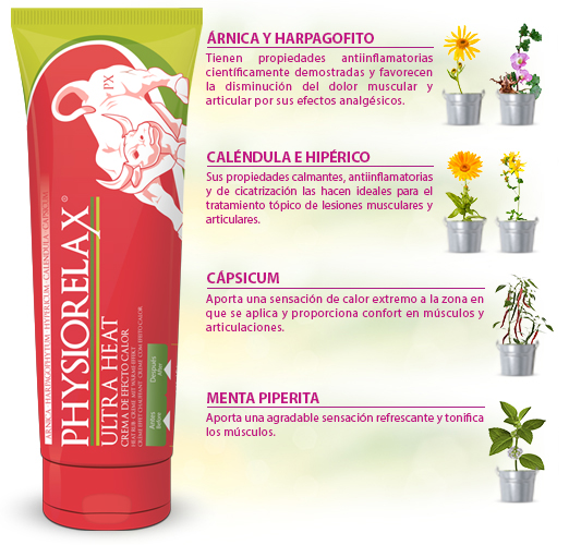 Physiorelax Ultra Heat crema 75ml es una crema de masaje deportivo de efecto calor formulada con extractos naturales. Sus componentes principales son el árnica y la capsicina, siendo este último un efectivo rubefaciente. Indicada especialmente para masajes antes y después de un esfuerzo muscular. En el lugar de aplicación de la crema se eleva la temperatura de la zona de la piel y se activa la circulación sanguínea, proporcionando confort en músculos y articulaciones.