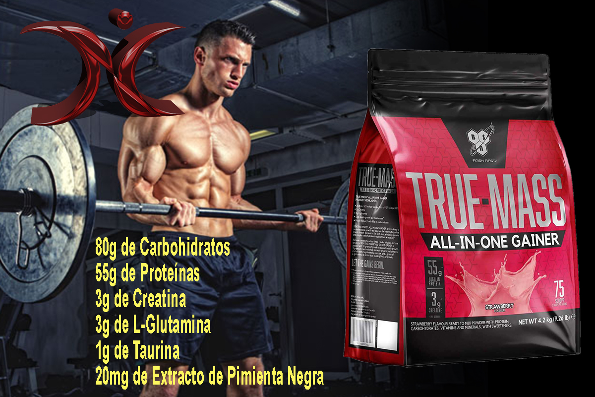 True-Mass All-In-One Gainer de BSN es un preparado alimenticio en polvo con sabor listo para mezclar, con proteínas, hidratos de carbono, vitaminas y minerales, con edulcorantes.