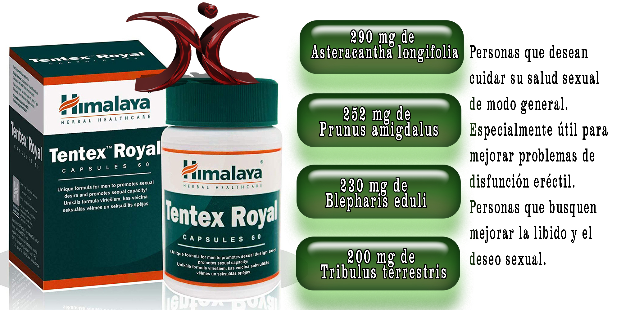 Tentex Royal Himalaya es un producto especialmente formulado para ayudar a la salud sexual de los hombres. Los ingredientes naturales de Tentex Royal tienen propiedades afrodisiacas, por lo que actúan incrementando el deseo sexual y serían de gran utilidad en personas con alteraciones de la erección, incluso podrían ser de ayuda en la eyaculación precoz. El mecanismo de acción se asocia a la capacidad de estos extractos para relajar el tejido cavernoso del pene e incrementar el flujo sanguíneo, facilitando la erección.