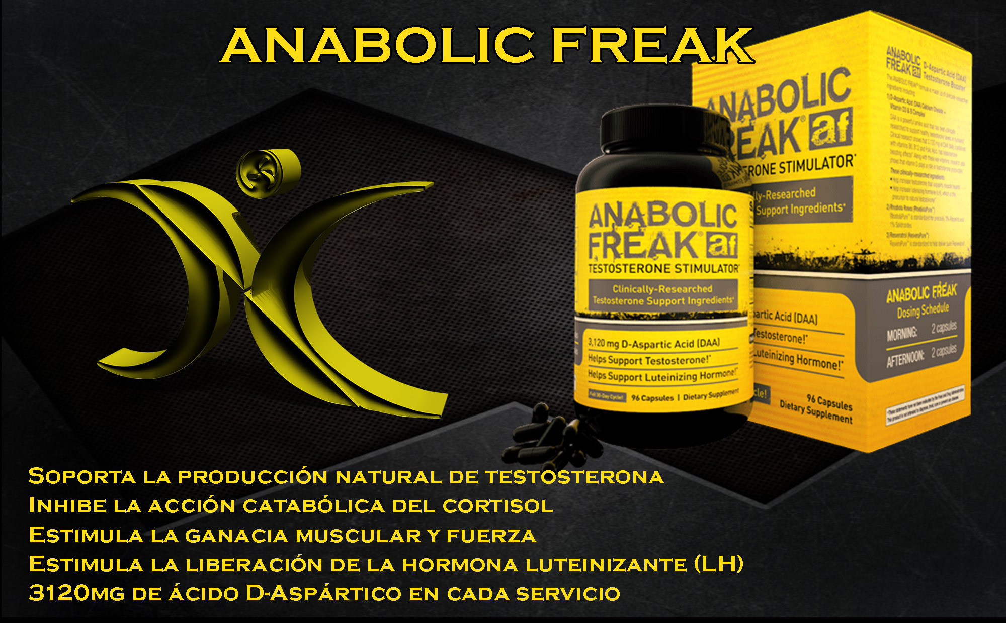 Anabolic Freak es uno de los más avanzados y poderosos suplementos potenciadores de la producción de testosterona natural. La fórmula avanzada de Anabolic Freak está científicamente basada en proveer la dosis precisa de Ácido D-Aspártico (DAA) con la que provocar la secreción natural de la testosterona.