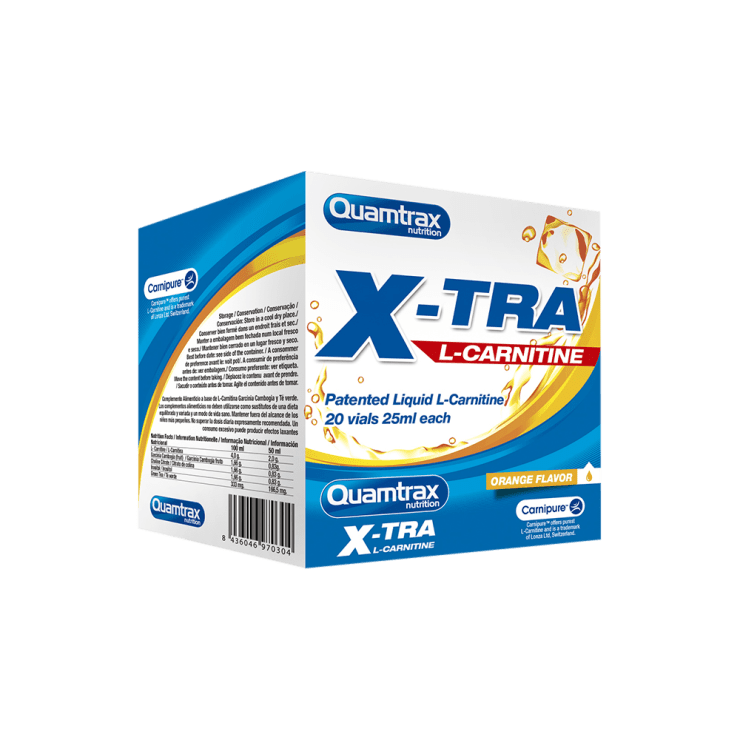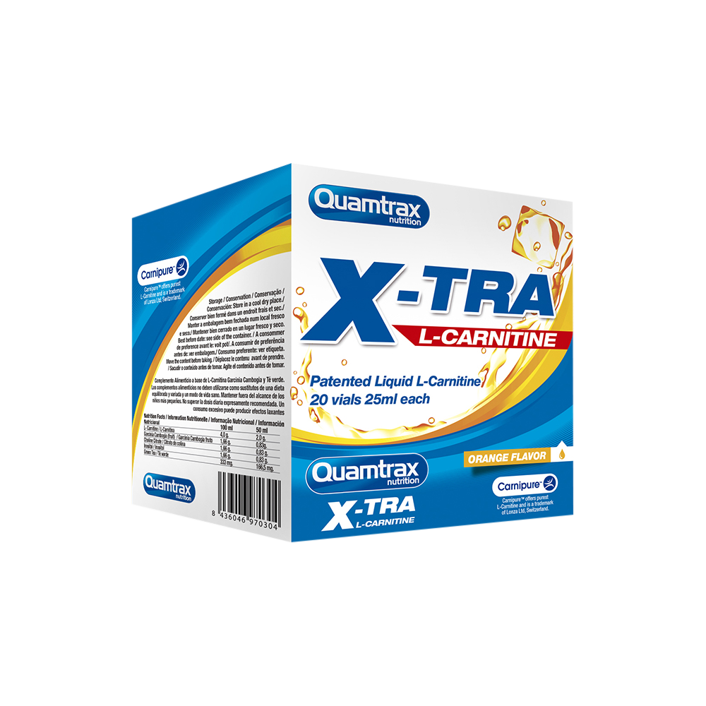 X-Tra L-Carnitine de Quamtrax Nutrition es un suplemento en cómodos viales monodosis líquidos que proporciona 1.200 mg de L-carnitina CarniPure™ potenciada con extracto de garcinia cambogia, citrato de colina, inositol, té verde y extracto de pomelo, y que ha sido especialmente diseñado para favorecer la utilización de la grasa como fuente energética.
