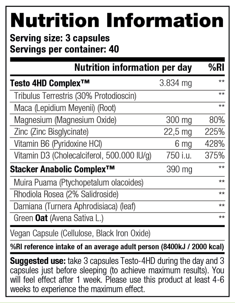 TESTO-4HD contiene todo lo que necesitas para hacer saltar tu producción natural de testosterona. Cada dosis cuenta con 10 potentes ingredientes clínicamente investigados con un efecto sinérgico, que estimulan a los receptores andrógenos a producir una y otra vez más testosterona. Se potencian tus aspectos masculinos, especialmente la intensidad de entrenamiento, tu autoconfianza y la agresividad de entrenamiento. Por si esto fuera poco, STACKER 2 te ofrece además un aumento considerable de la masa muscular proporcionándote un físico sin igual.